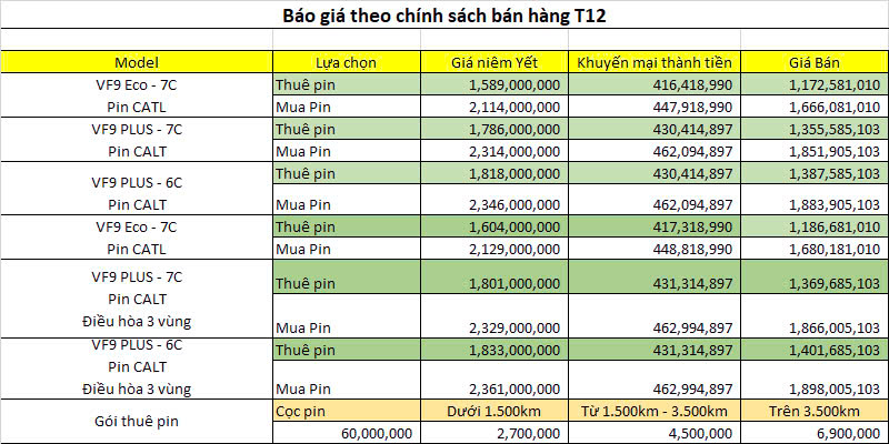Bảng giá Vin Fast VF 9 Eco tháng 12